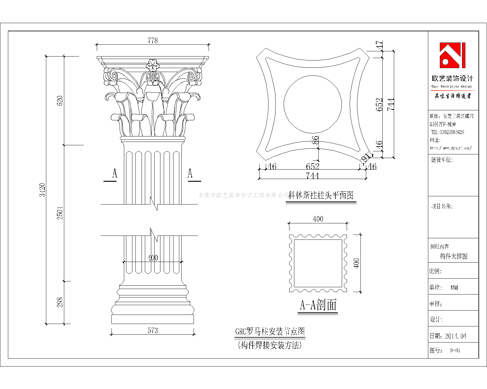 一、产品说明及适用范围: 广东欧艺公司的这种类型GRC罗马柱、欧式罗马柱、带槽罗马柱为科林斯罗马柱样式,一般应用作腰线或低层建筑的檐线。GRC罗马柱、欧式罗马柱、带槽罗马柱造型优美,是经典的GRC罗马柱、欧式罗马柱、带槽罗马柱样式,为提高建筑物档次和品味必用,视角冲击力强。尺寸可按要求定制。 二、产品规格尺寸(尺寸可按要求定制): W400、W450、W500、W550、W600等 三、GRC罗马柱、欧式罗马柱、带槽罗马柱施工安装节点图: